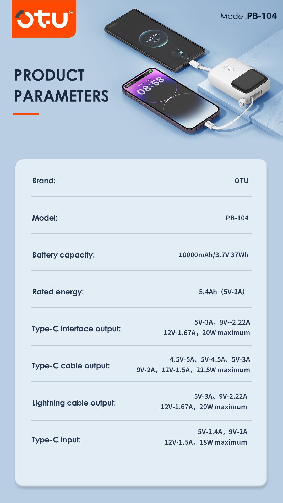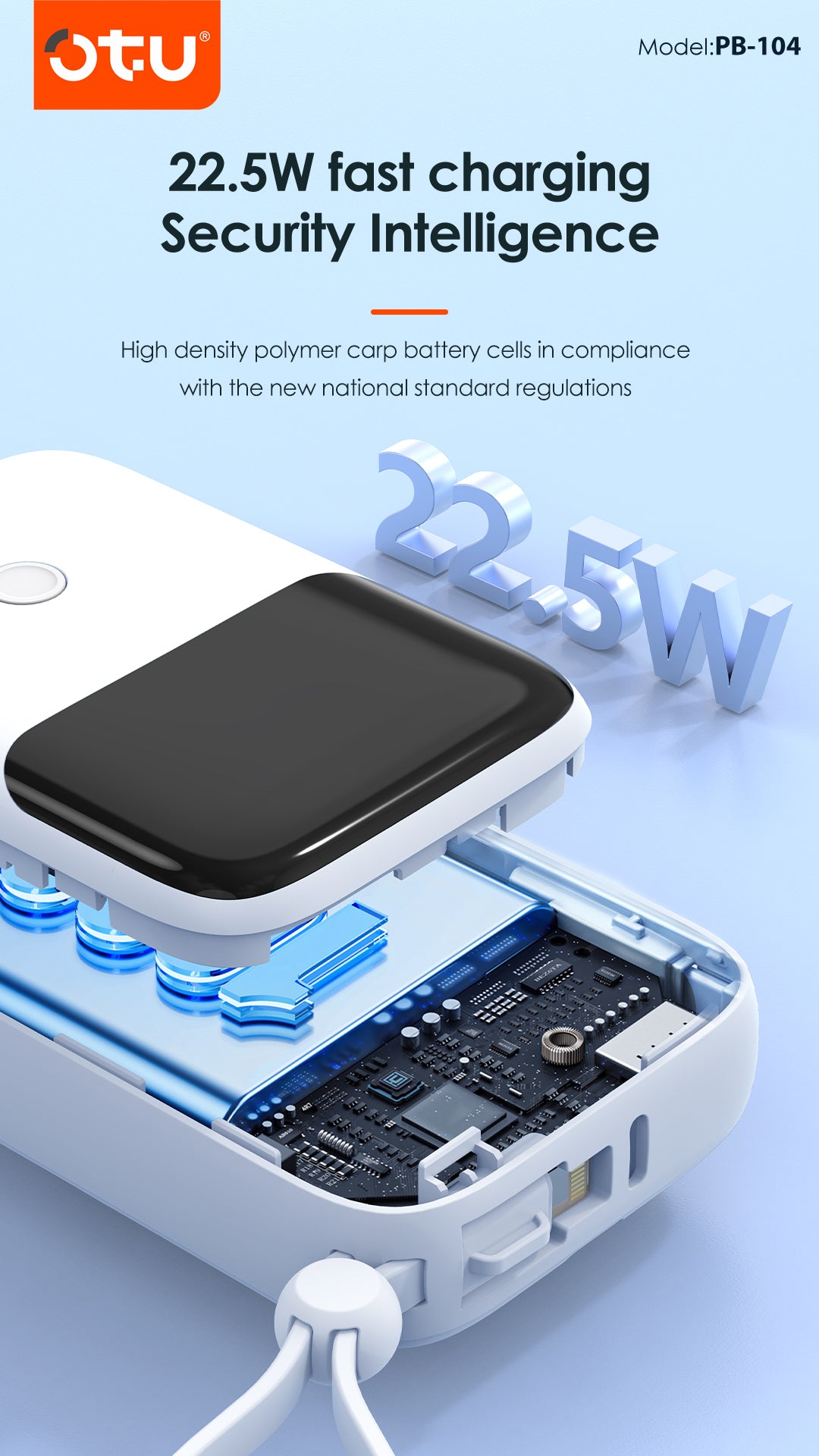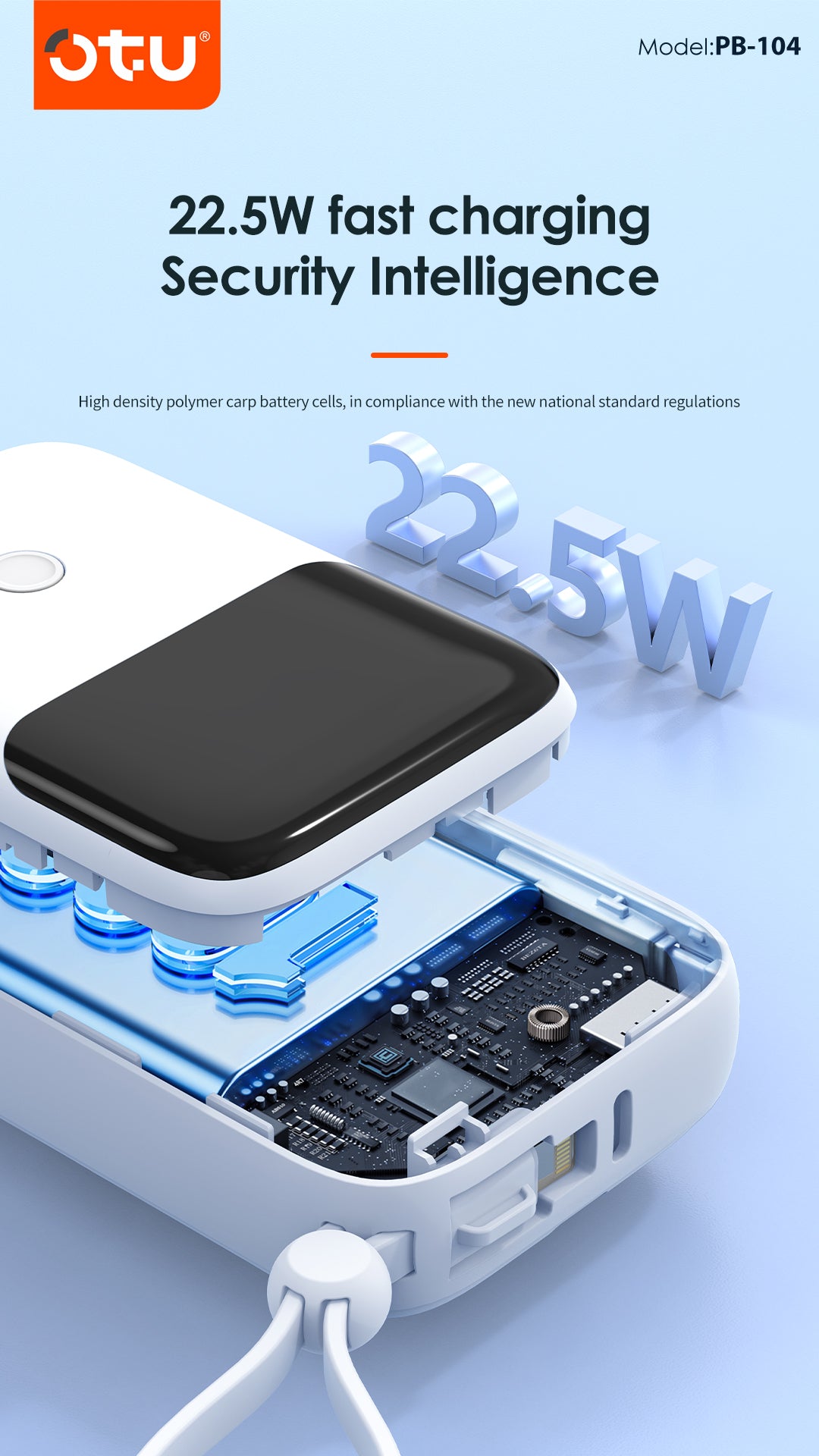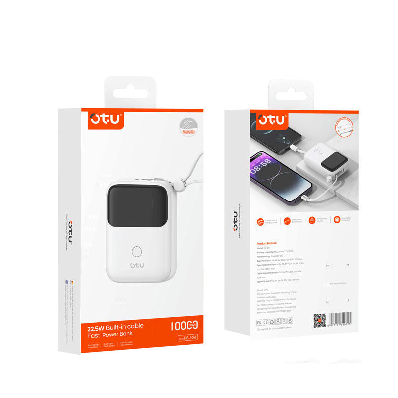 OTU PB104 10000mAh 22.5W Fast Charging Power Bank with Detachable Cables & Lanyard – Portable Charger with Type-C and Lightning Output